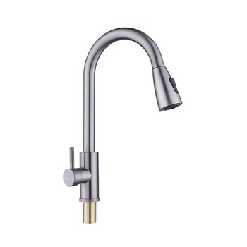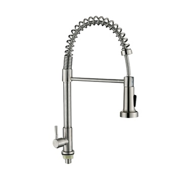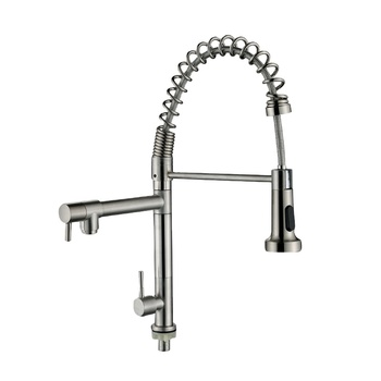 صنبور حوض مطبخ من النحاس المصقول من الفولاذ المقاوم للصدأ للسحب لأسفل من المصنع ، صنبور زنبركي مزدوج الوظيفة من المصنع للمطبخ